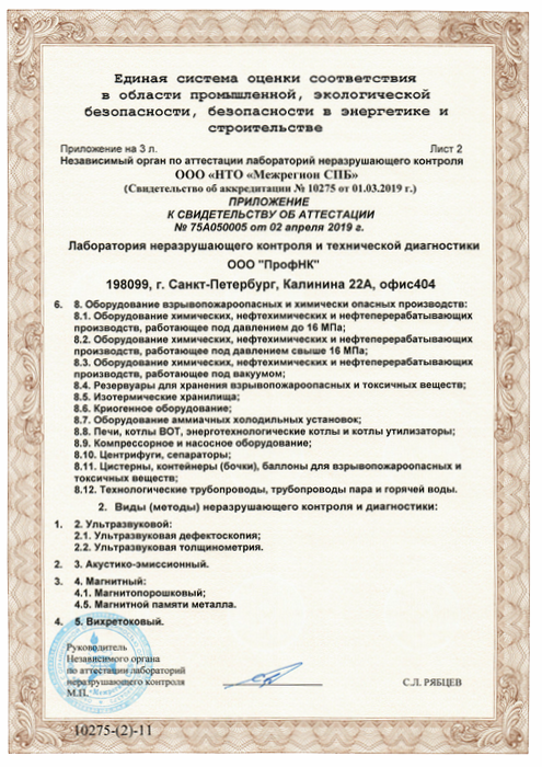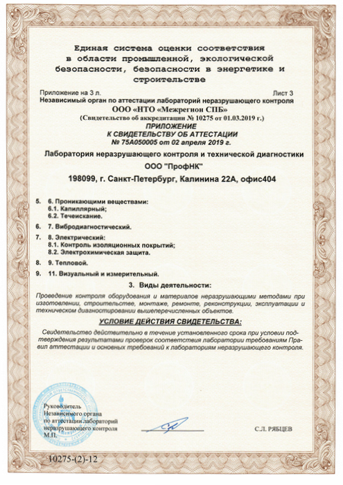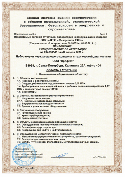 ООО «ПрофНК» имеет аттестованную лабораторию НК и ТД, укомплектованную всем необходимым оборудованием для проведения работ в строгом соттветствии с требованиями Правил, НТД и др. Документов, регламентирующих деятельность в области технической диагностики и неразрушающего контроля.